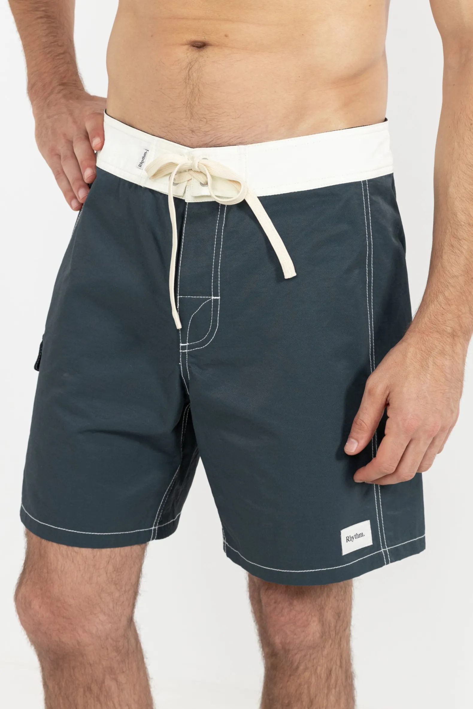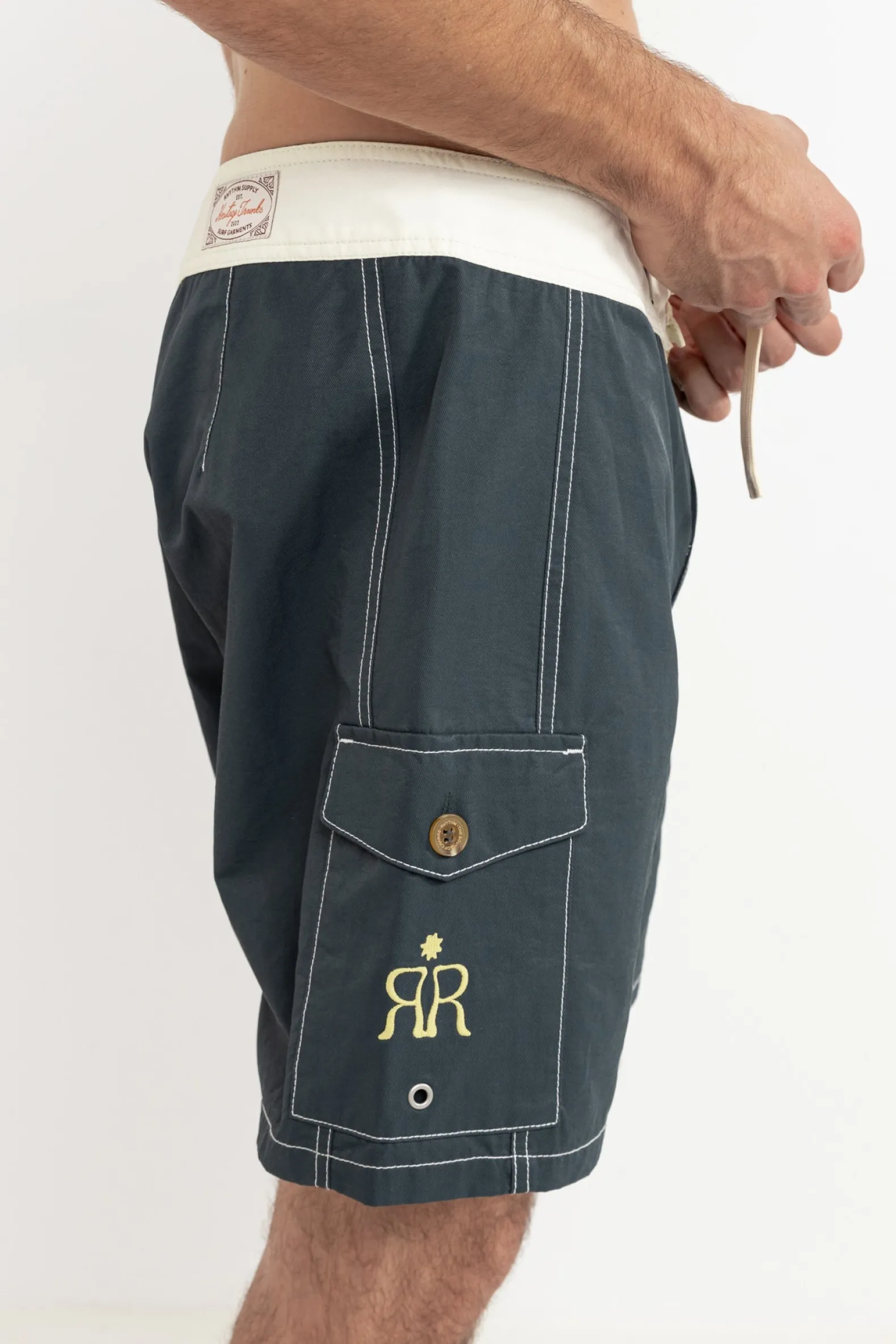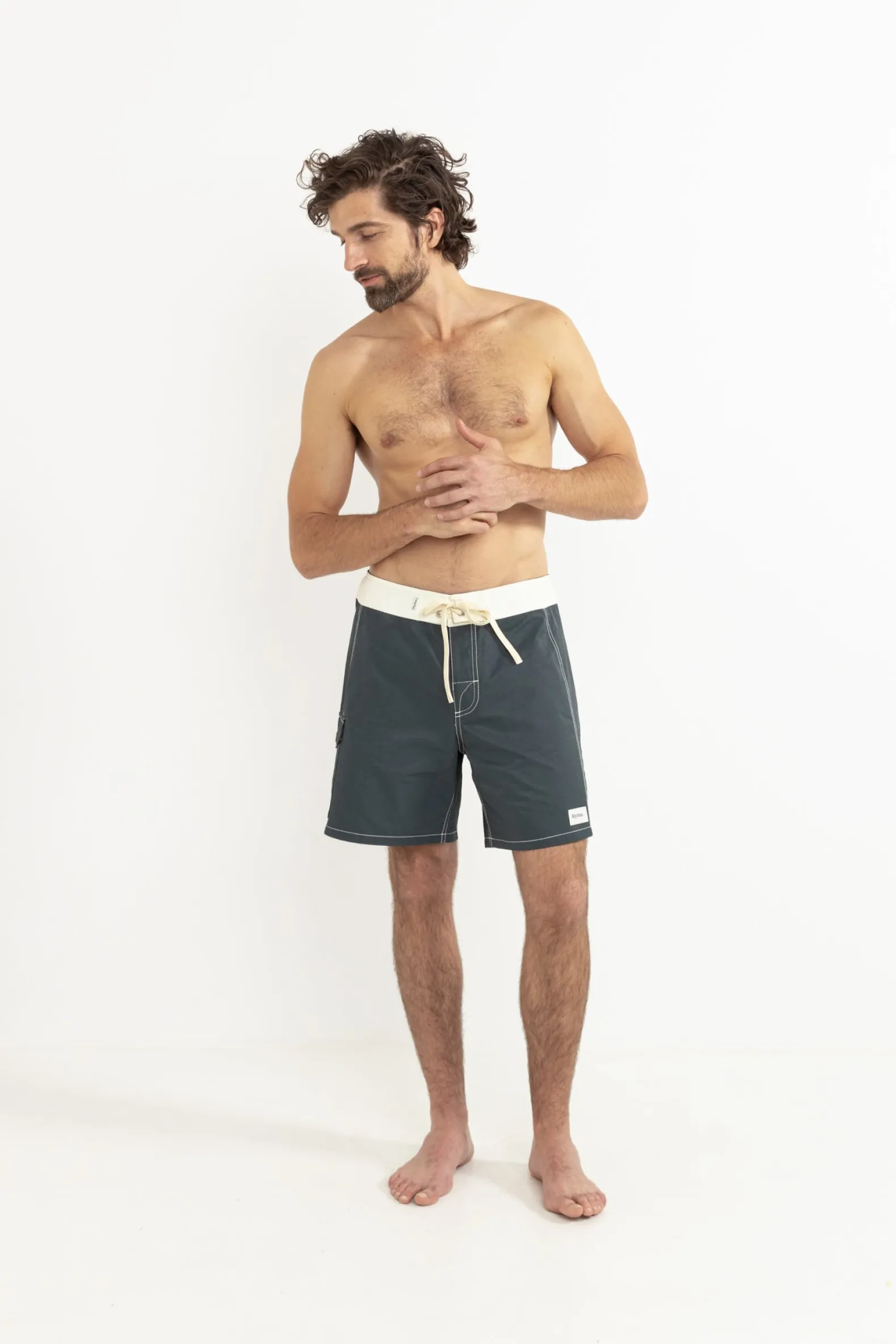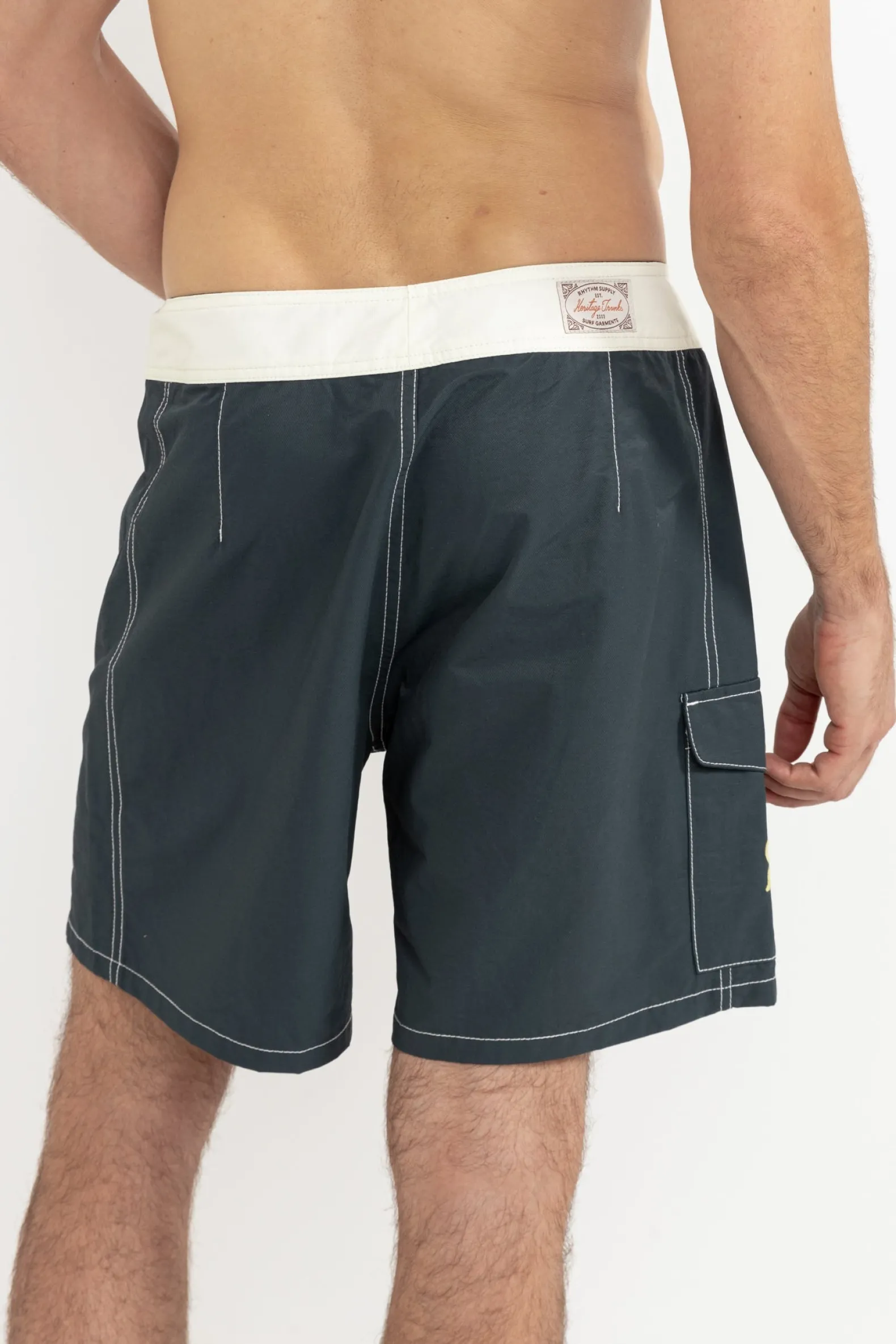 The Breakers Block Trunk in Stone Blue features a striking white contrast waistband and embroidered artwork on the right-hand pocket. Made for comfort and versatility, it’s a summer staple.