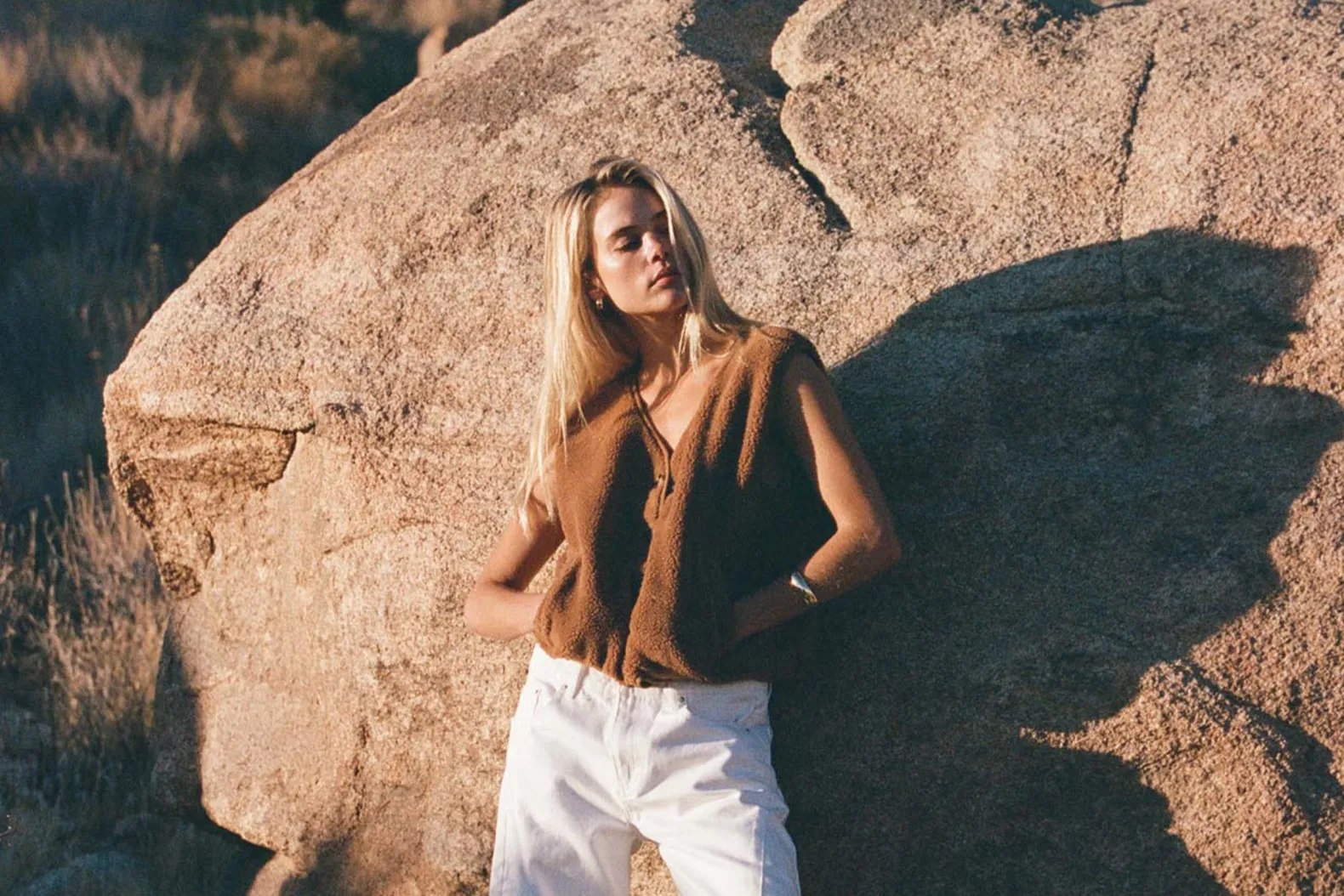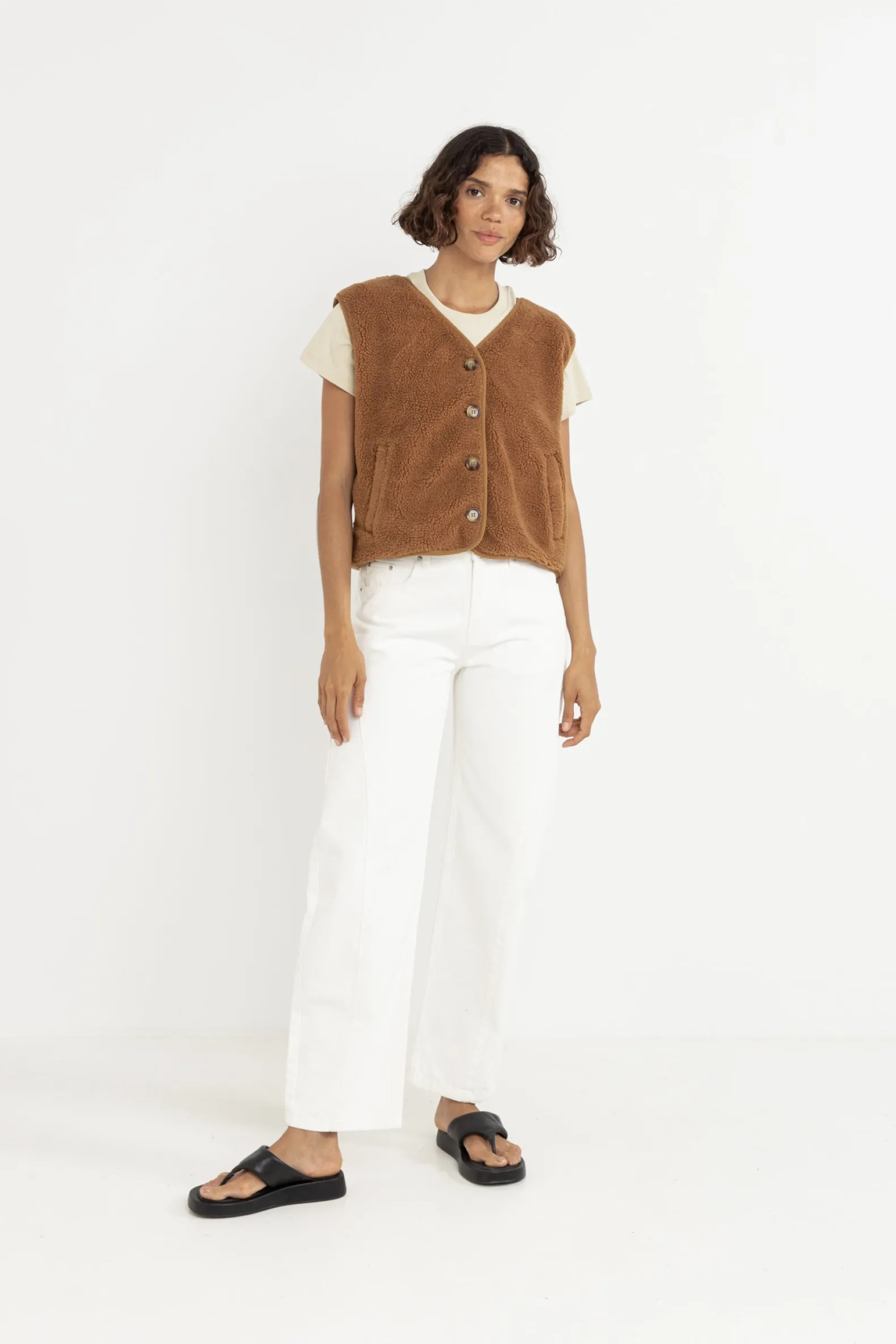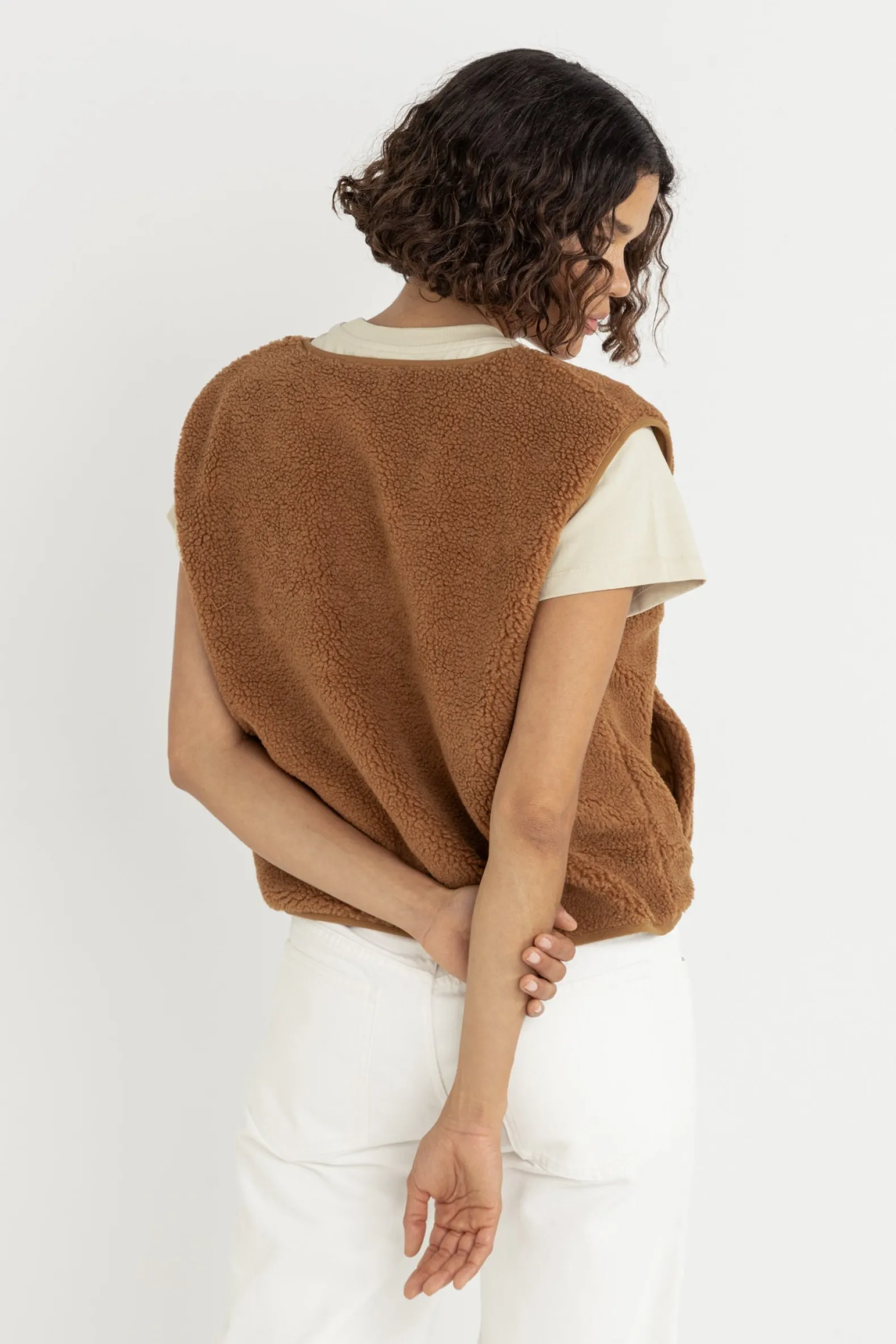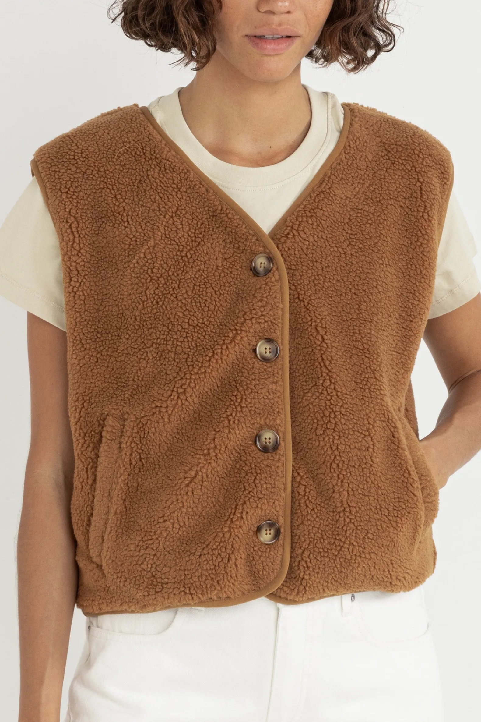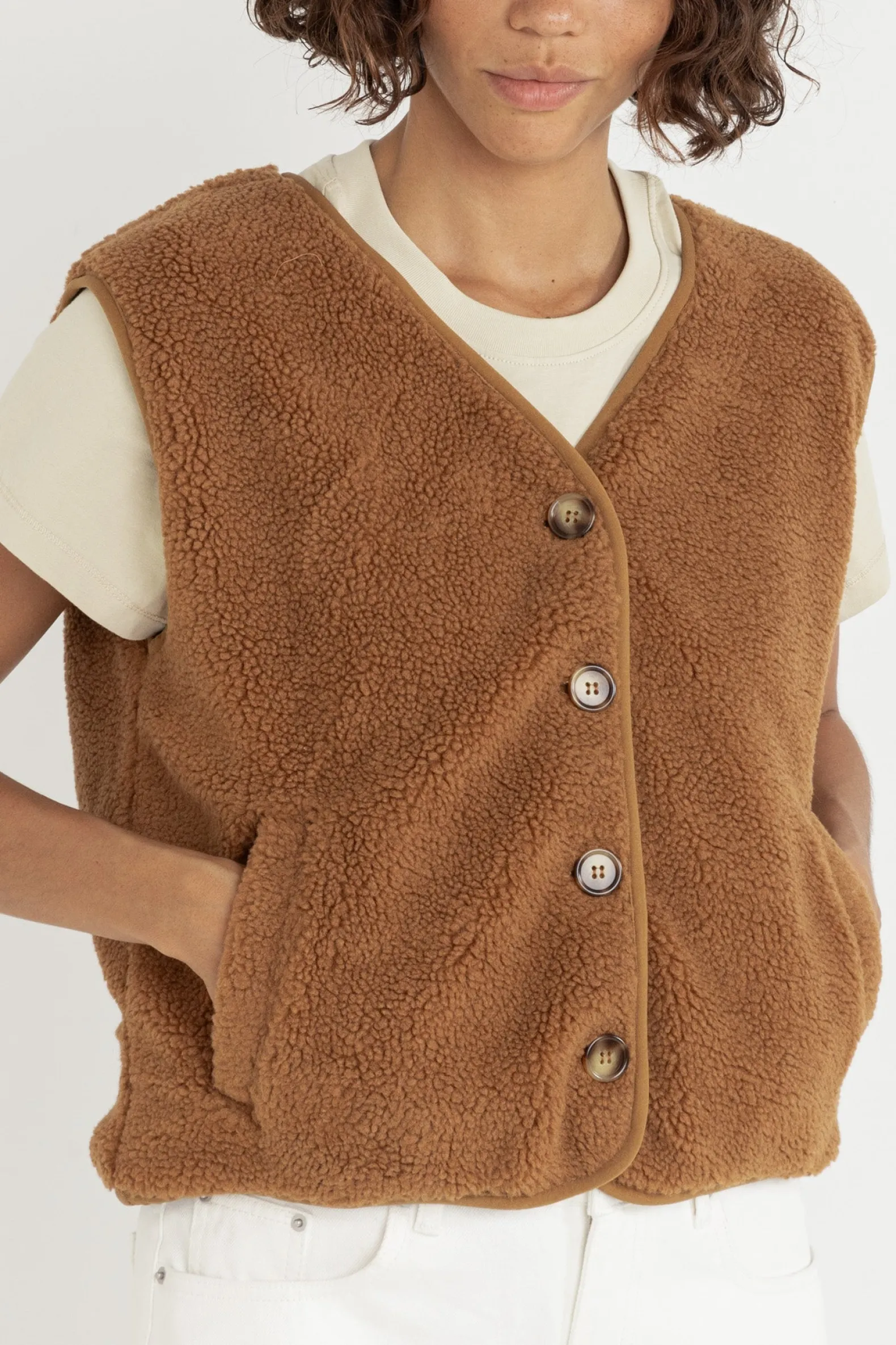 Wrap yourself in the Ella Sherpa Vest in Tobacco, crafted with plush sherpa fabric for ultimate warmth. This boxy-fit design features a horn button closure, combining practical functionality with coastal-inspired style.
