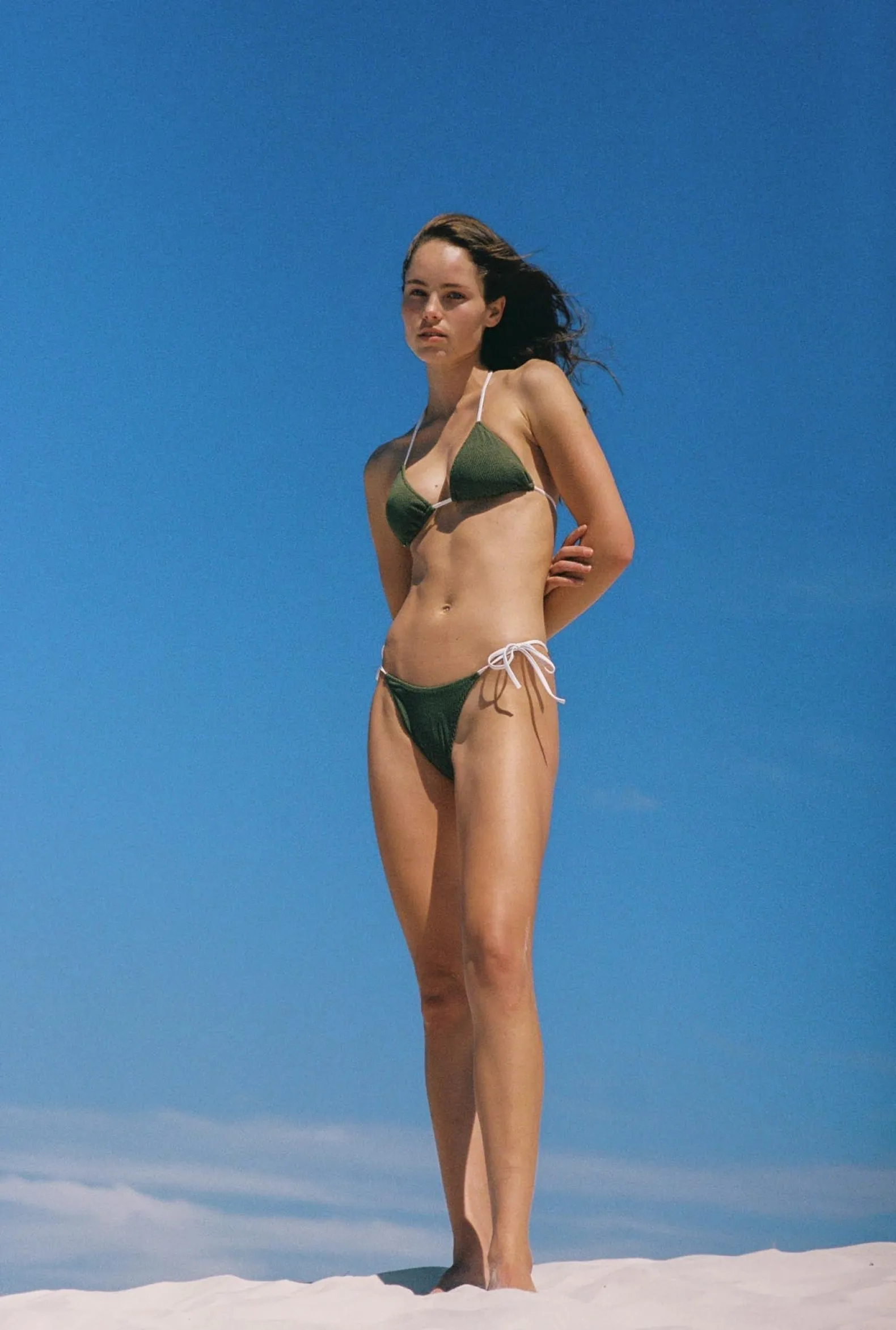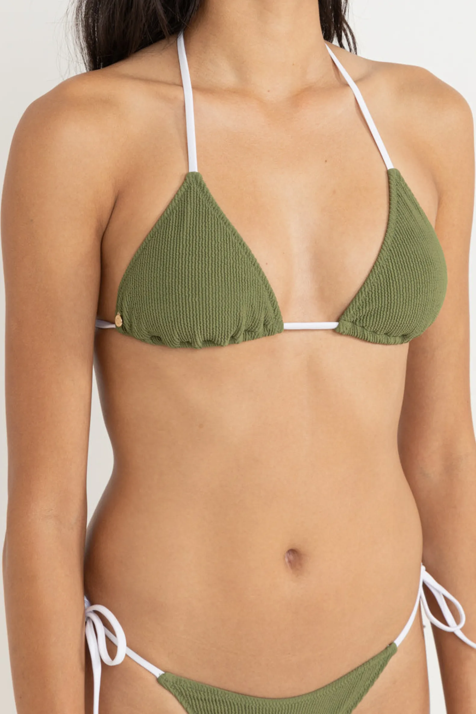 With its earthy olive tone and white contrast binding, this tri top brings coastal vibes. Removable cups, adjustable straps, and the Rhythm metal coin logo ensure a perfect fit.