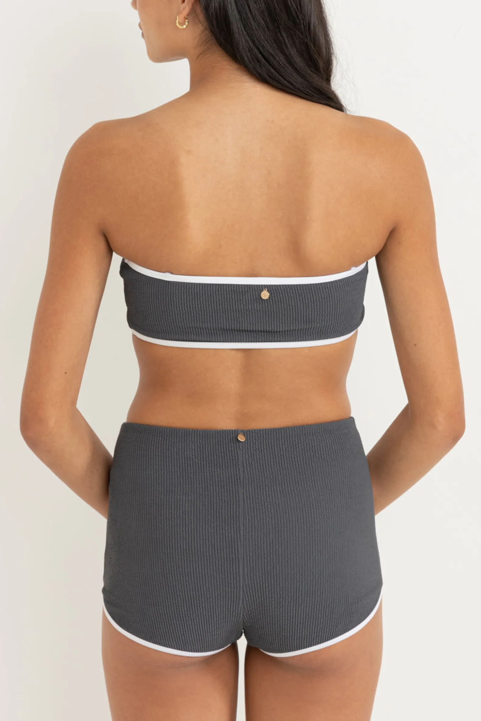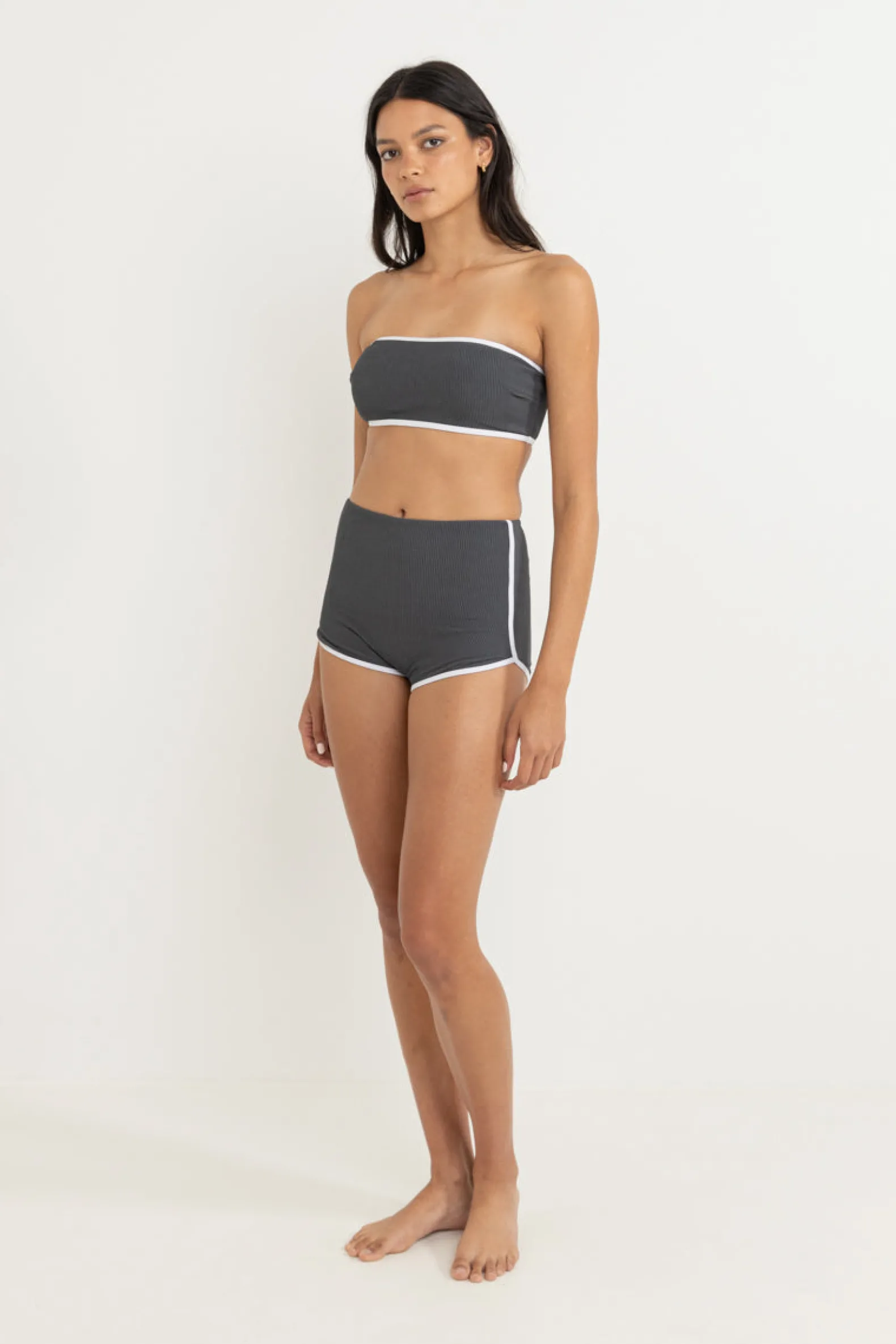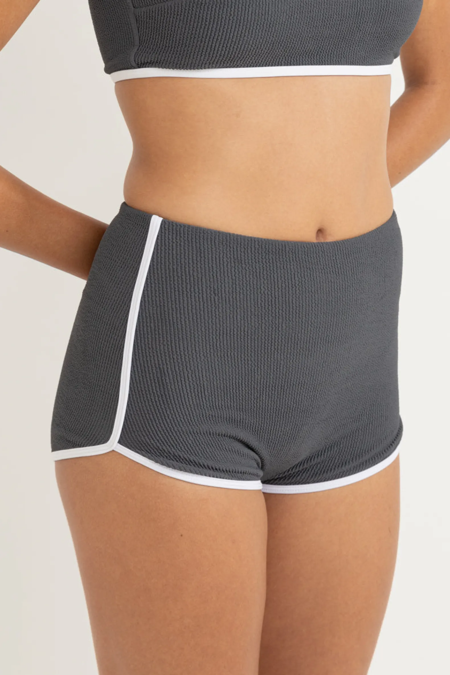 This graphite surf short delivers full coverage with white contrast binding and a high-rise fit. The Rhythm metal coin logo adds a signature detail.