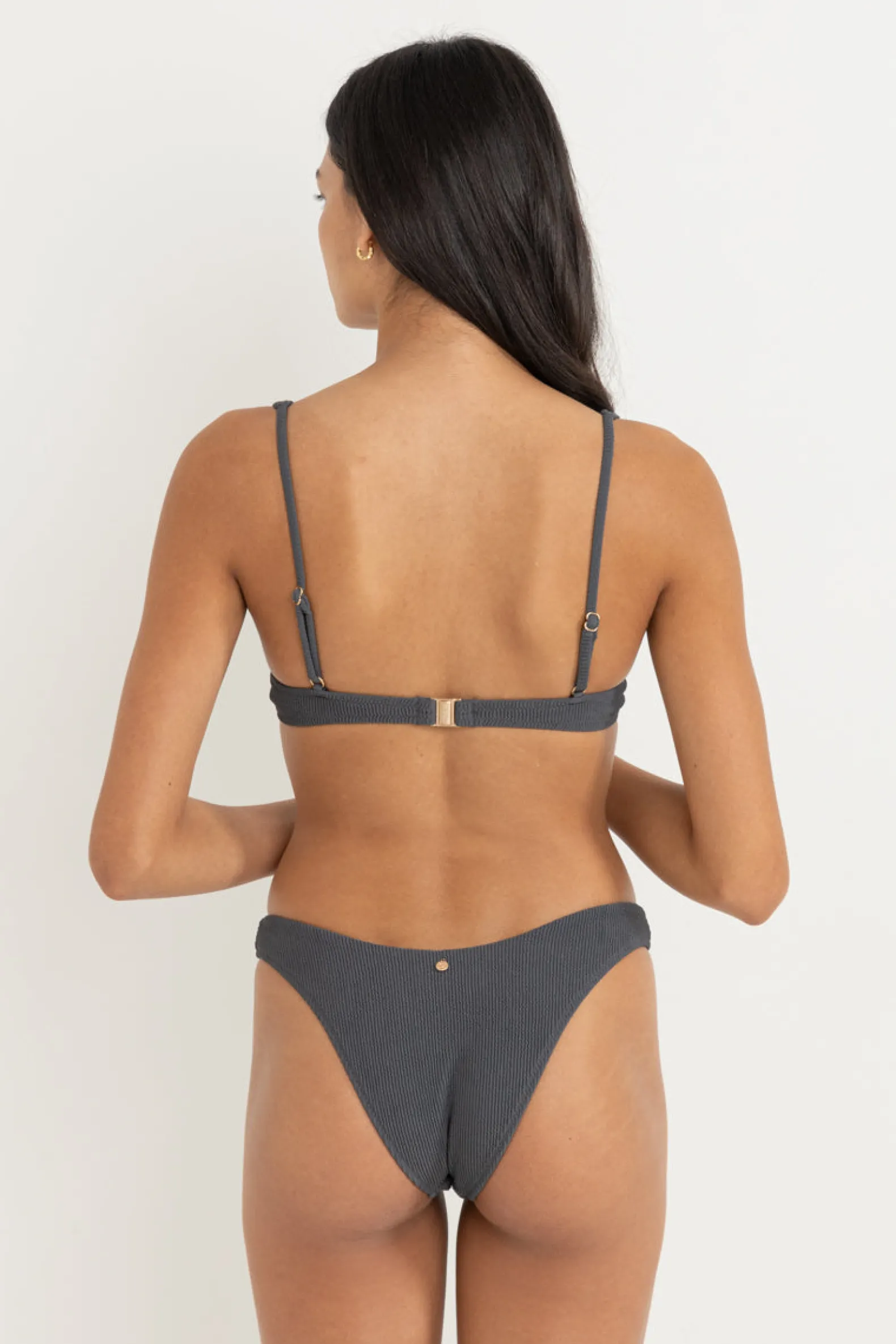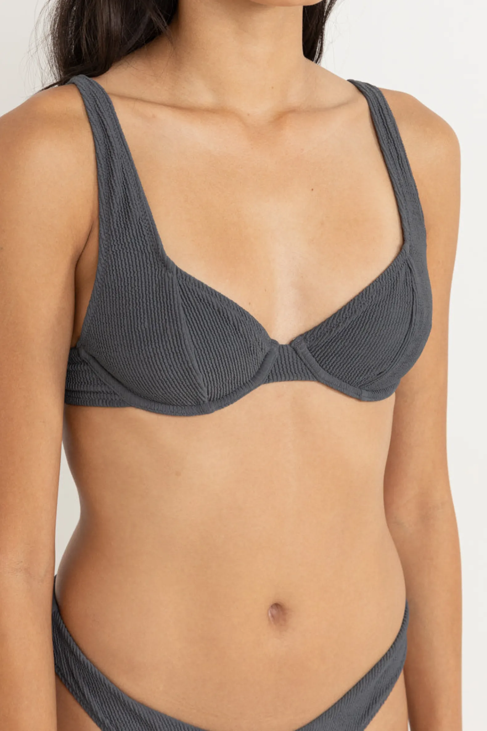 This graphite underwire top offers a secure, flattering fit with adjustable straps and gathered detail. Ideal for A-D cup sizes, it’s finished with a Rhythm-branded clasp.