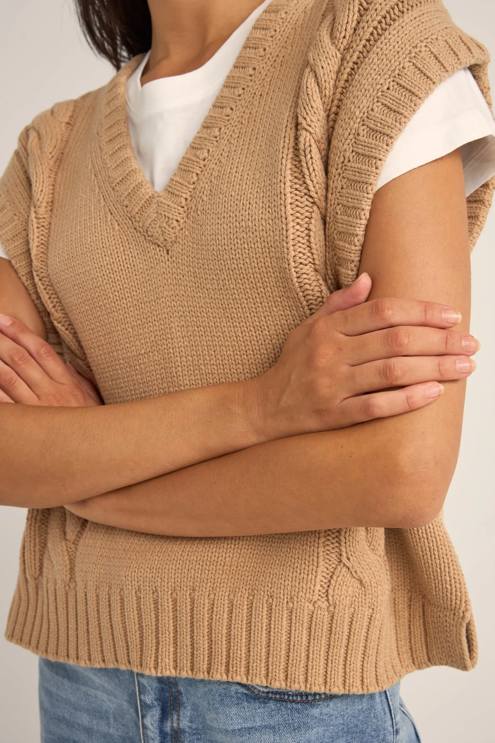 The Sand Finley Cable Knit Vest offers a soft, textured layer for your beach-inspired looks. The mid-weight chunky knit is crafted from cotton and acrylic, with its cable knit design, slouchy v neck and oversized fit adding warmth and style that weaves the intricate beauty of coastal landscapes in every stitch.