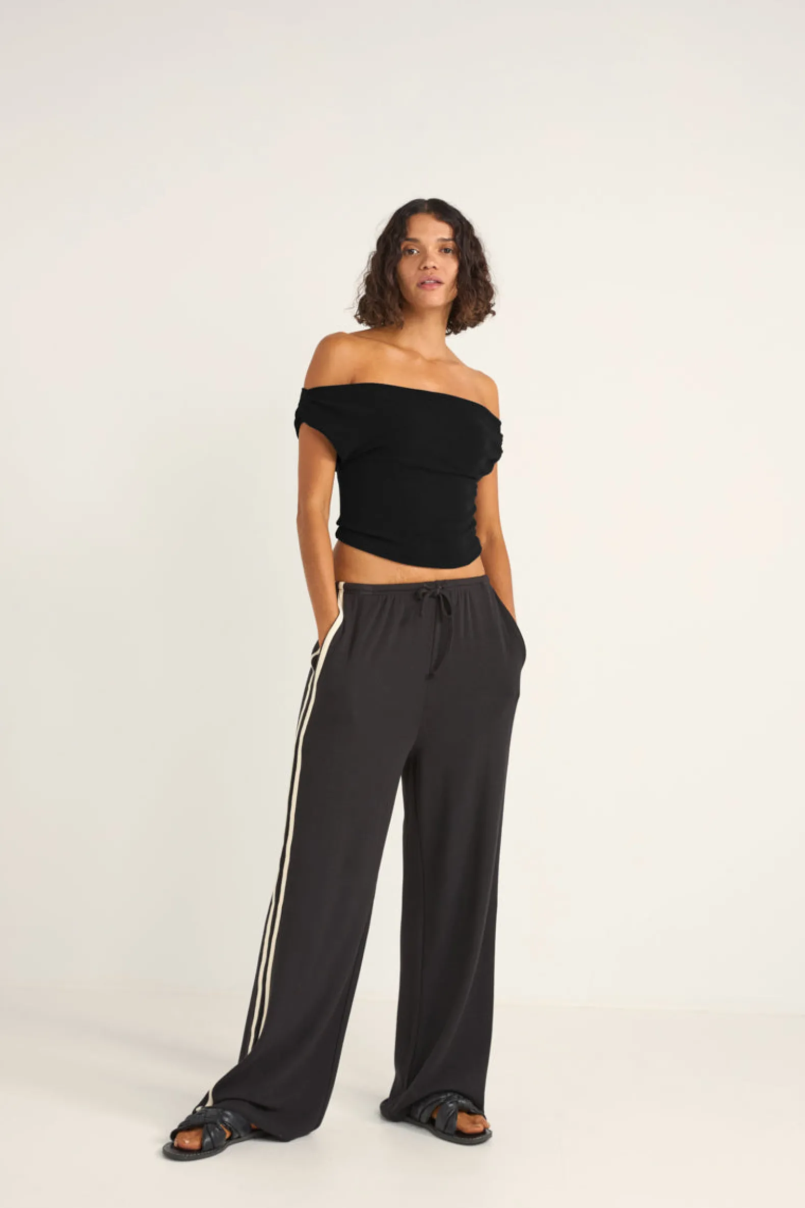 The Juno Off Shoulder Top in black features a relaxed fit with delicate shoulder gathers. Perfect for casual days or evening outings, it’s an easy, elegant staple.