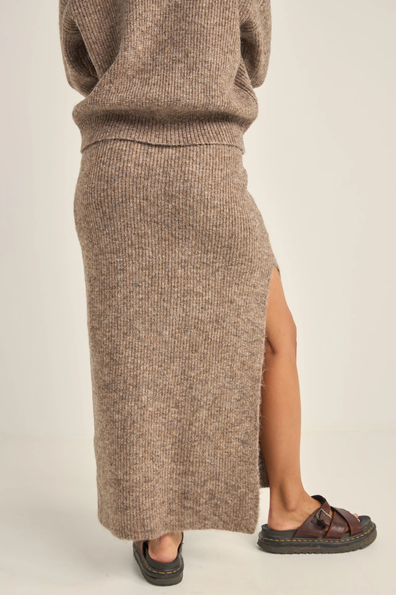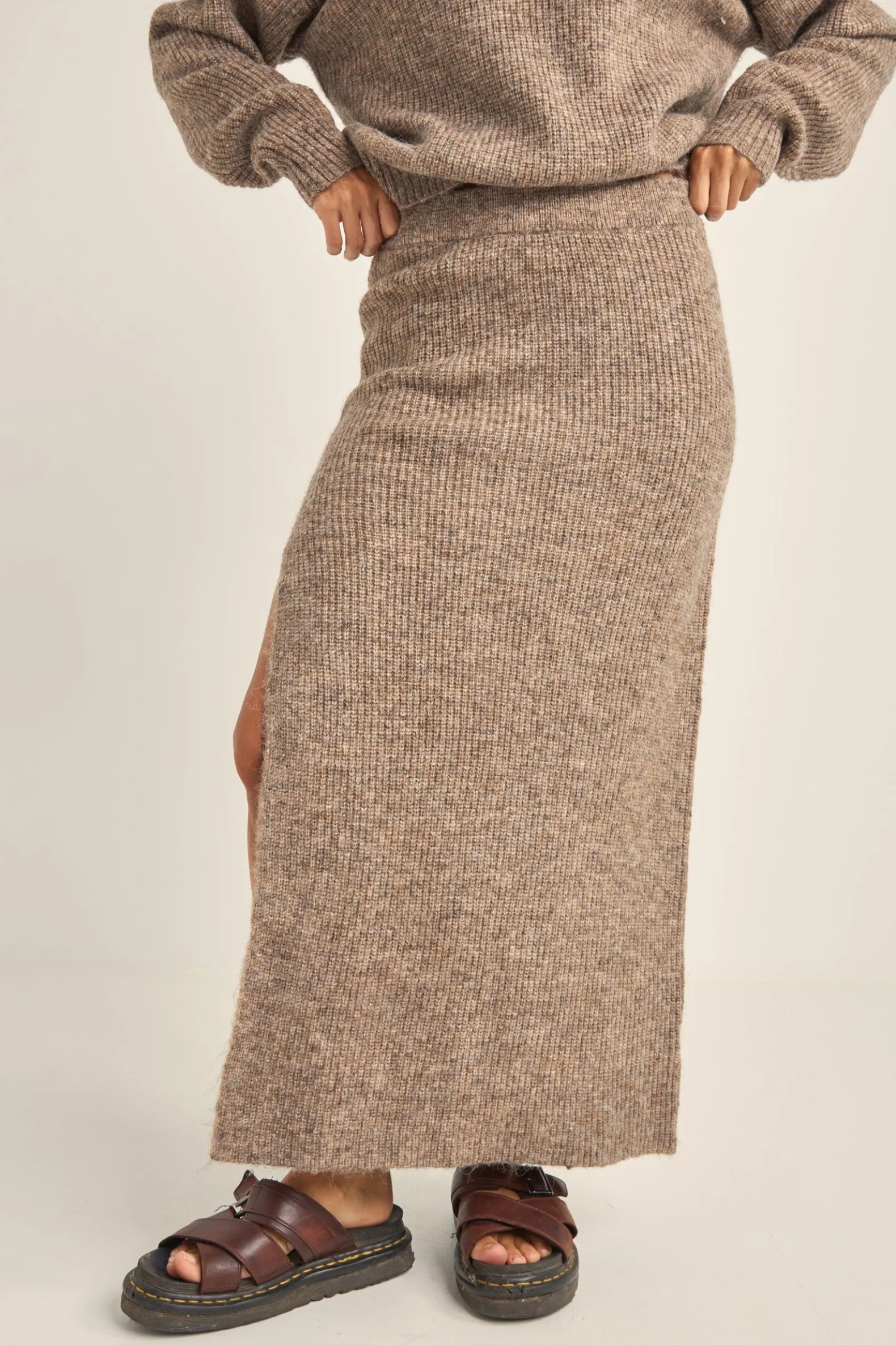 In a super soft blend of nylon, acrylic, polyester, and wool, the high-waisted Oatmeal Quinn Knit Midi Skirt is comfort knitted into form. Its elastic waistband and ribbed texture offer a cosy embrace, making it perfect for cool mornings on the sand or evening walks by the sea.