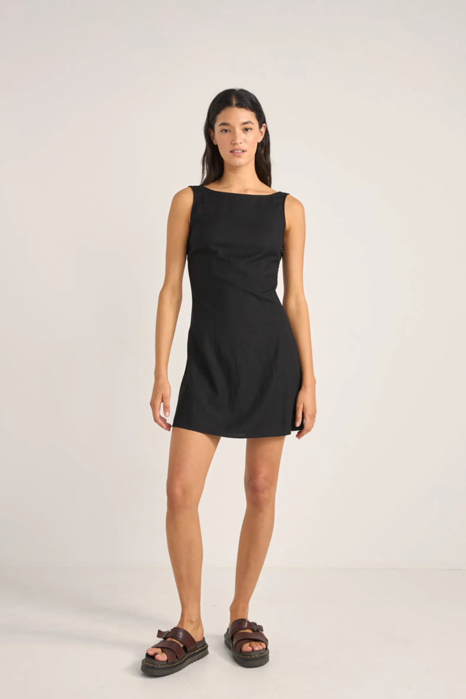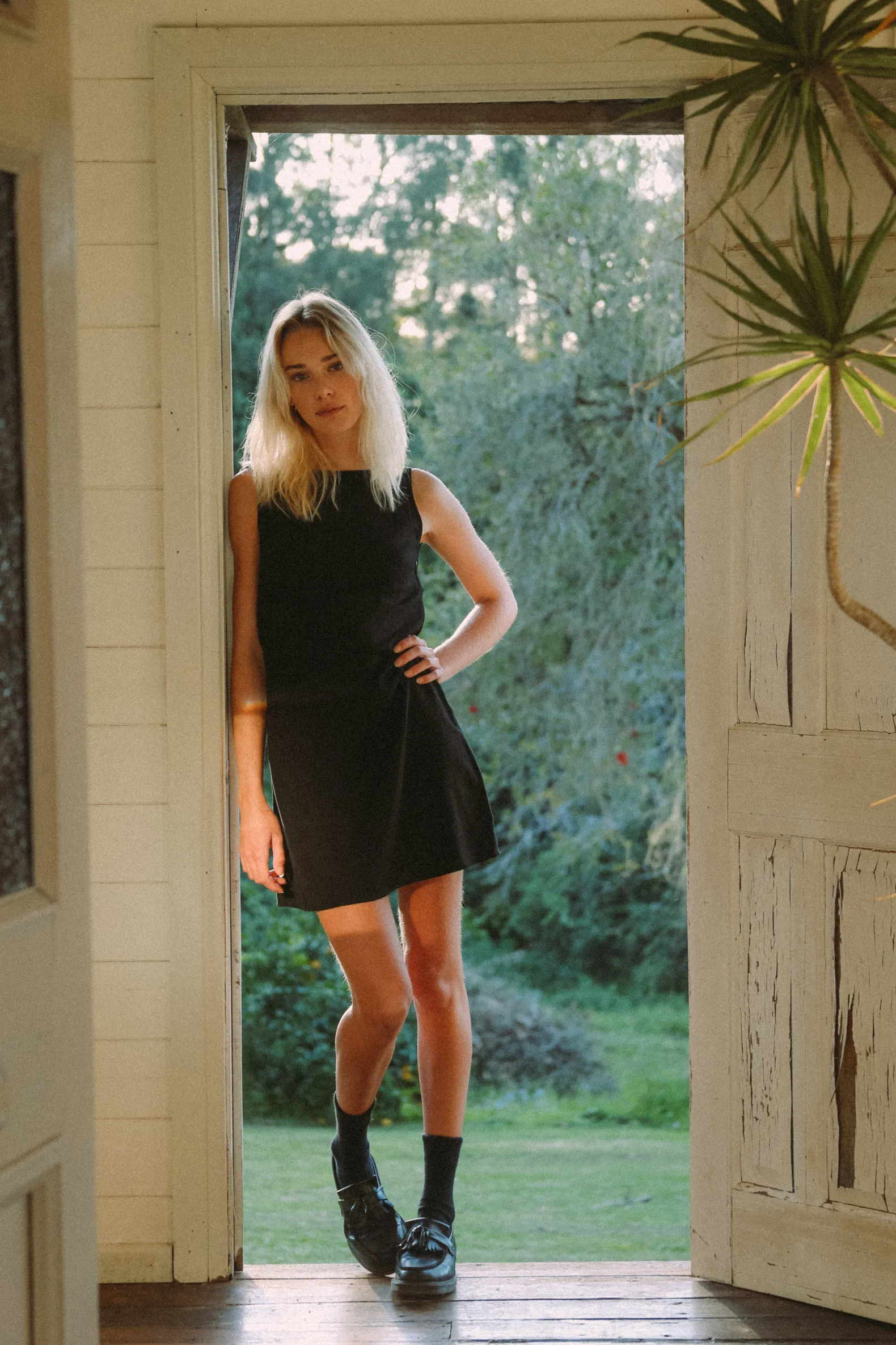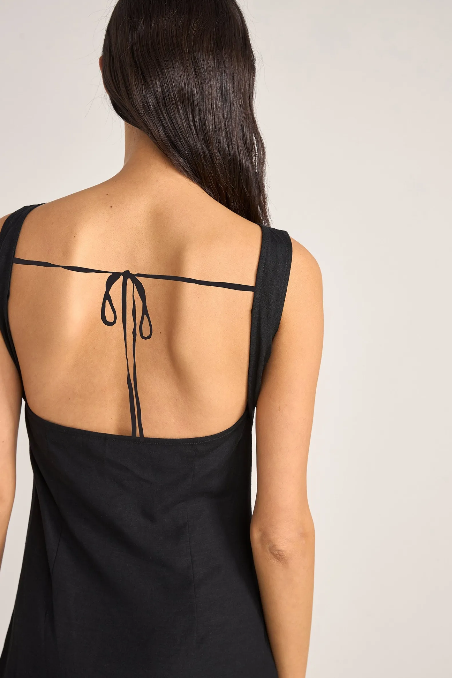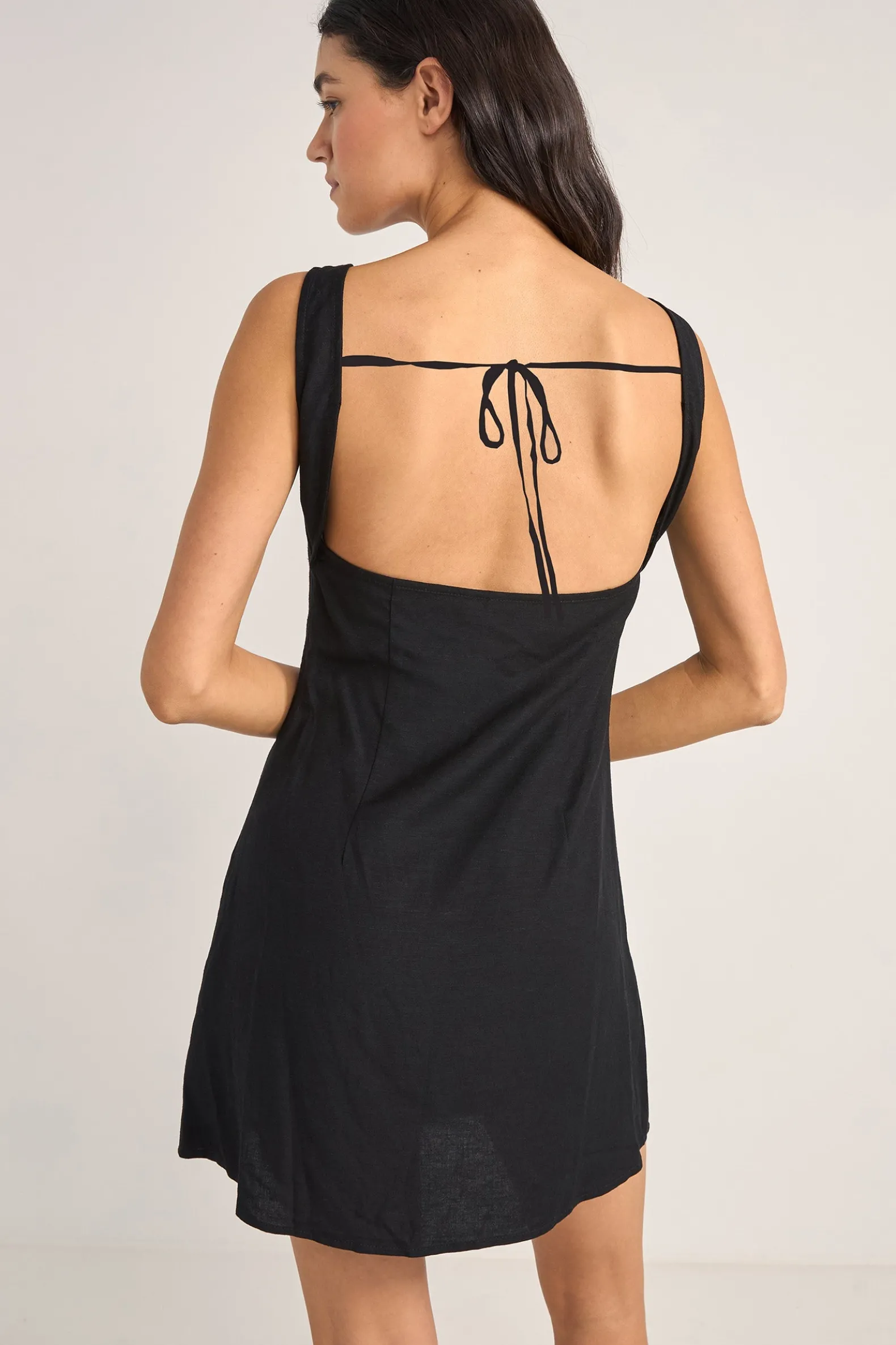 The Roselle Tie Back Mini Dress in Black features a boat neck and tie back closure for a chic, coastal vibe. Perfect for effortless style with a touch of sophistication.