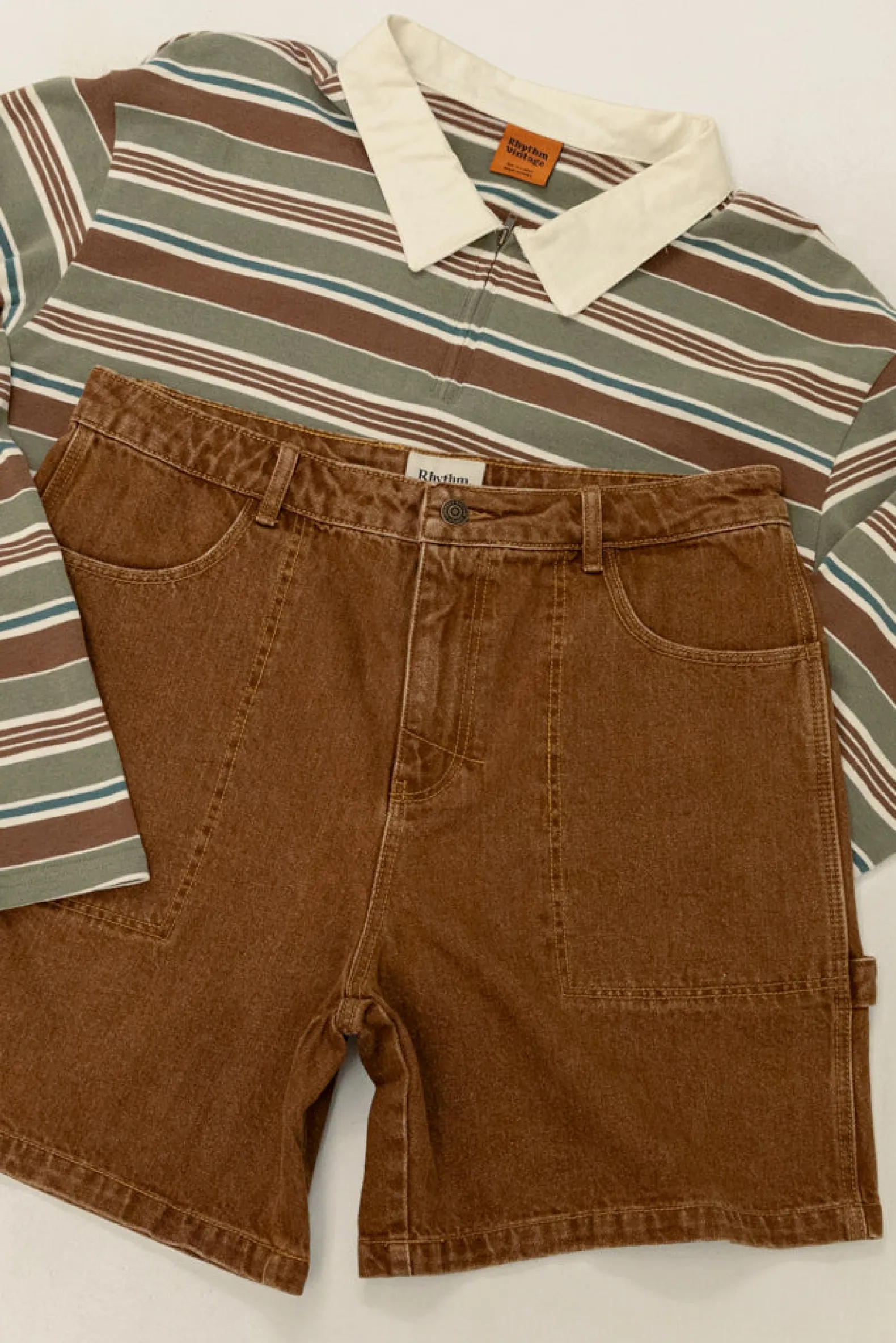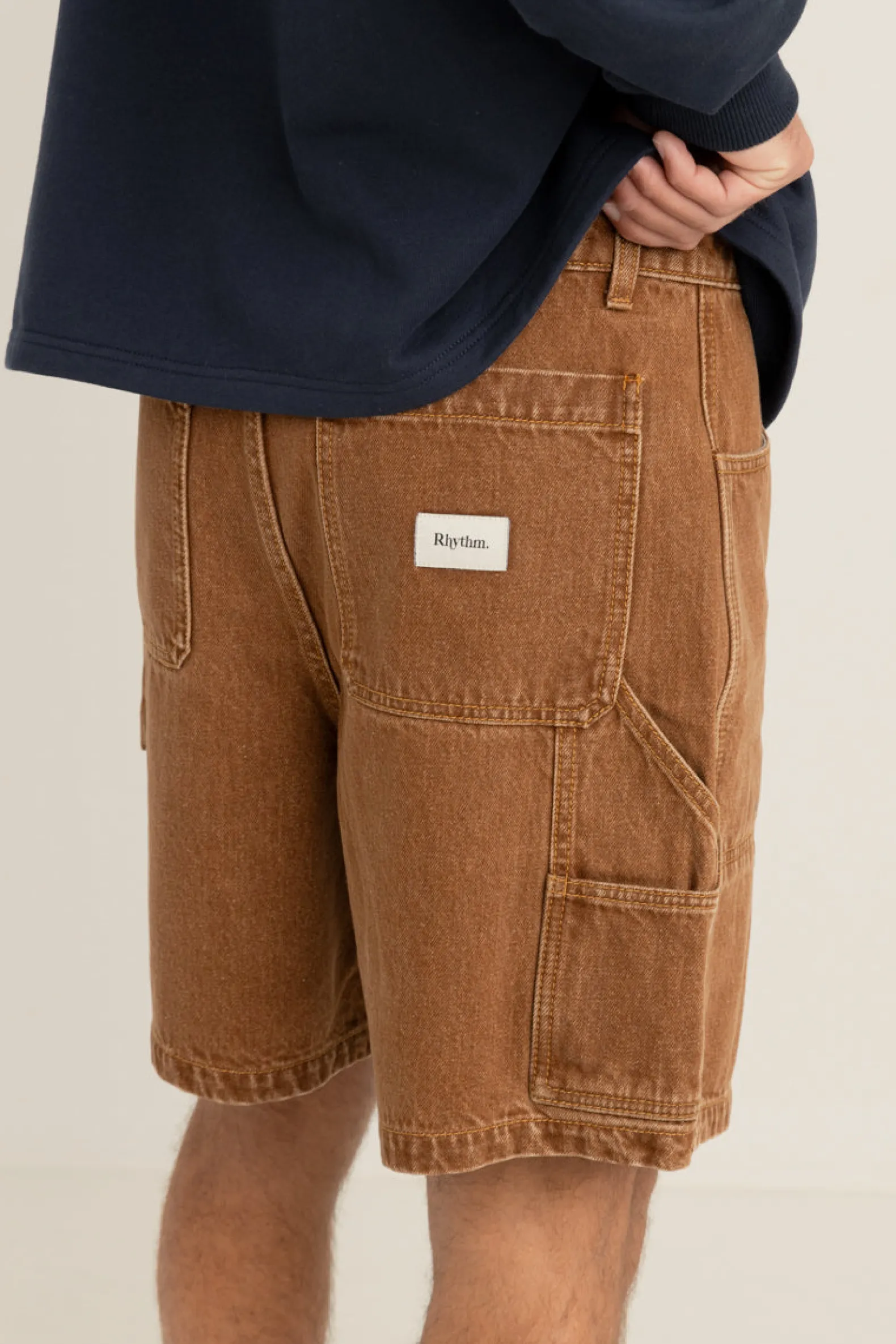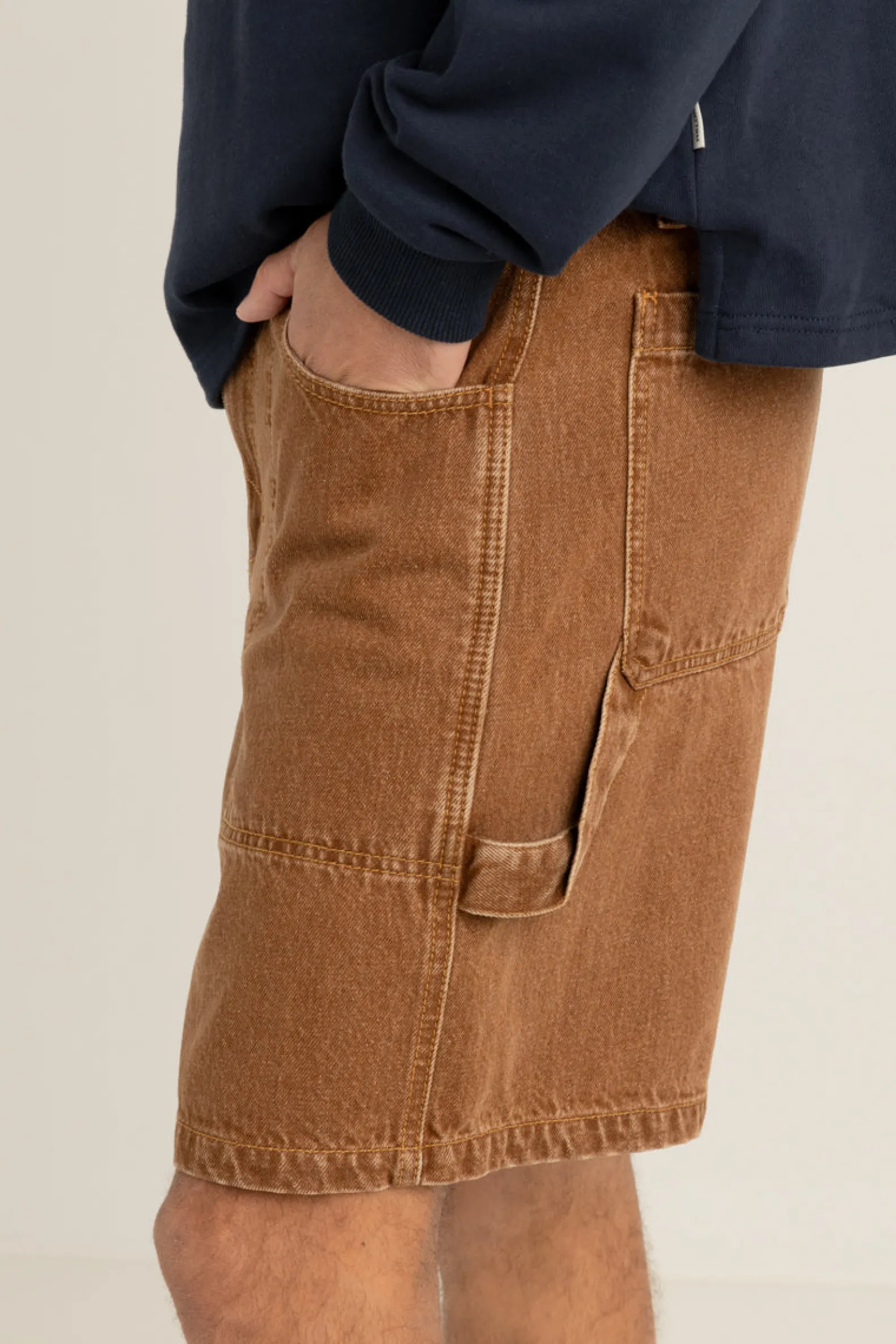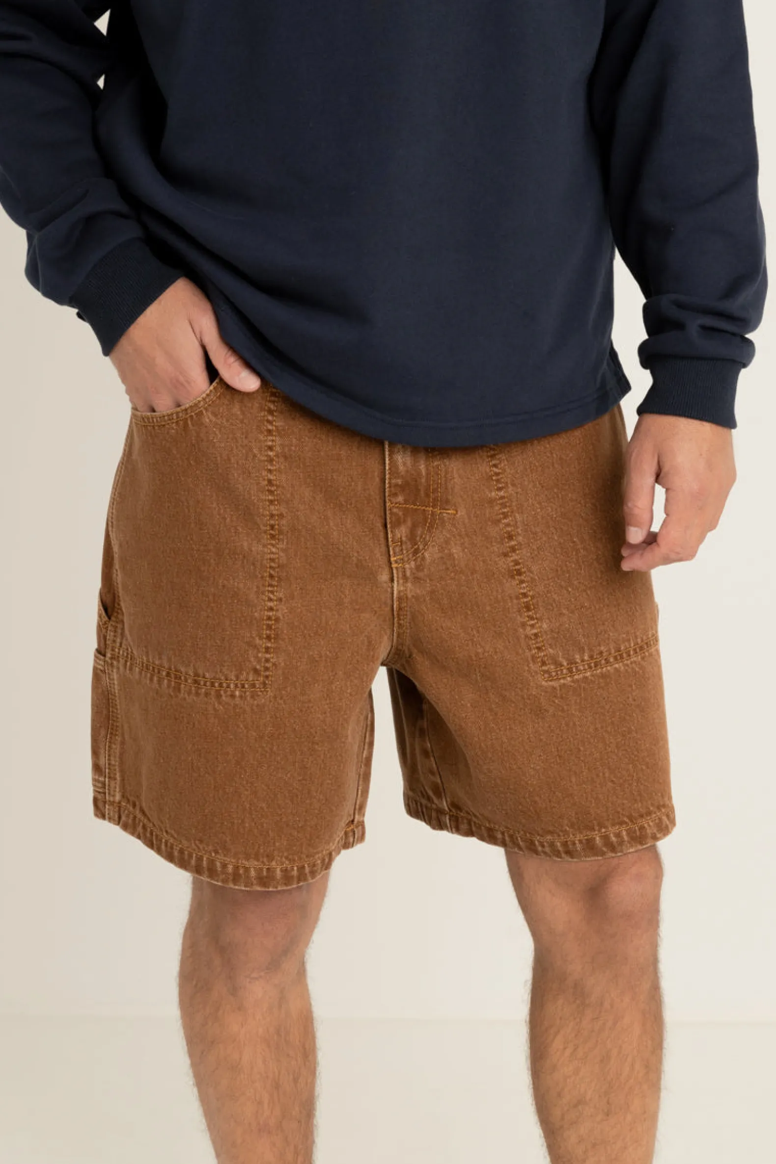 Vintage-inspired denim shorts with an open leg, extra pockets, and contrast stitching. Worn-washed for an authentic, aged feel.