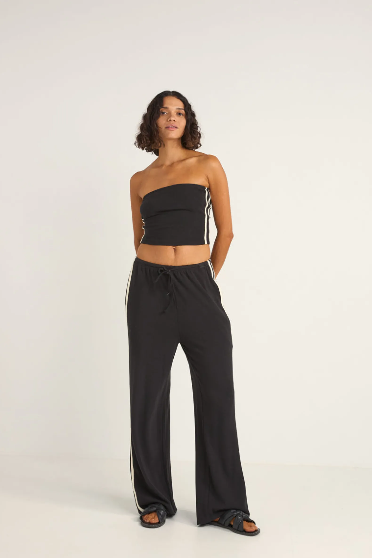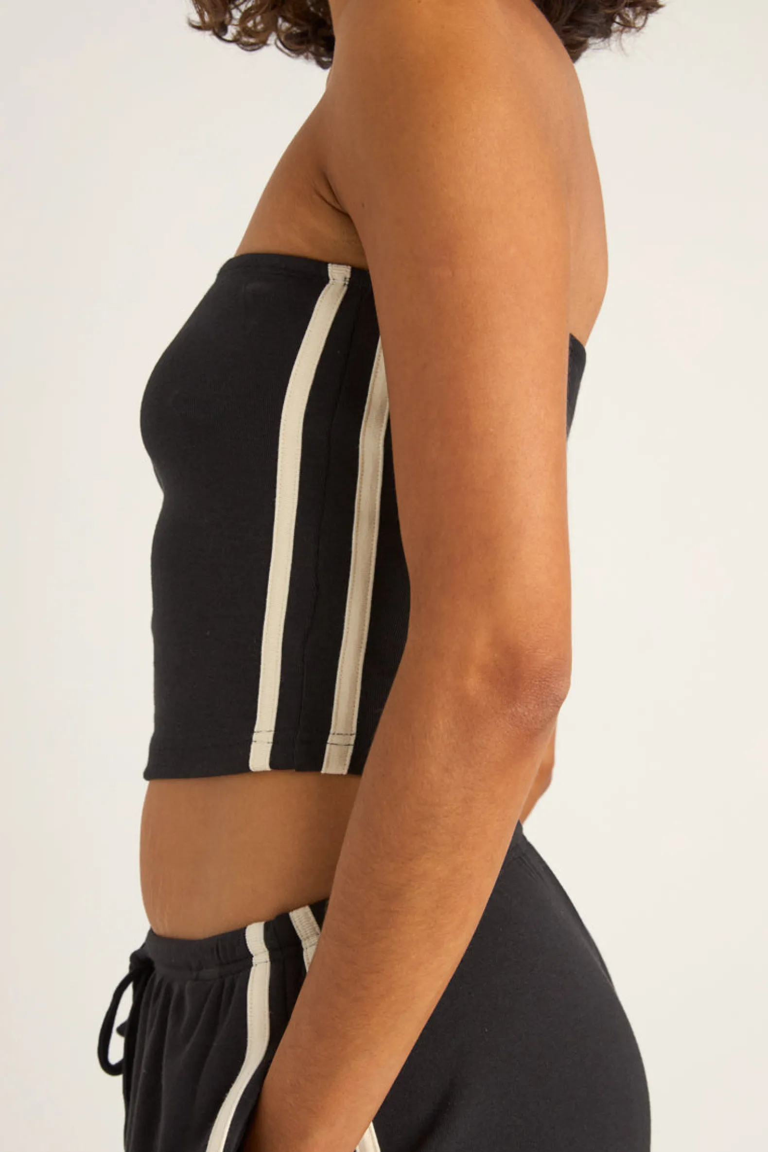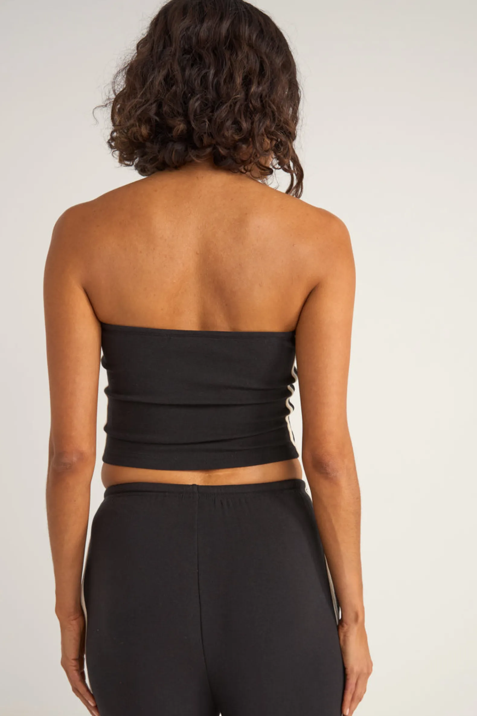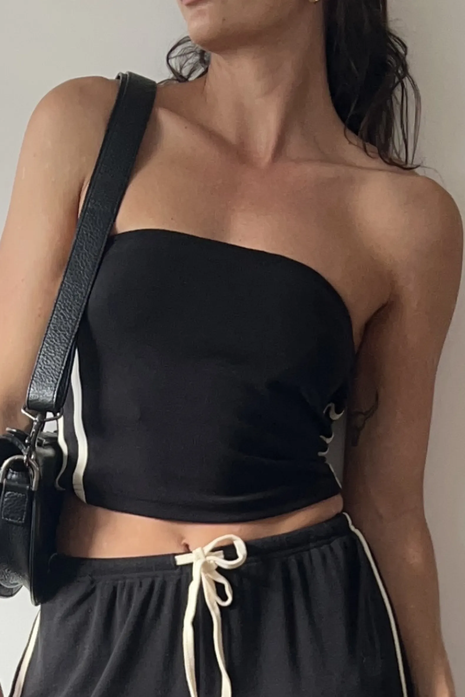 The Track Bandeau Top in Black offers grip tape for a secure and stylish fit. Ideal for pairing with relaxed pants or skirts.