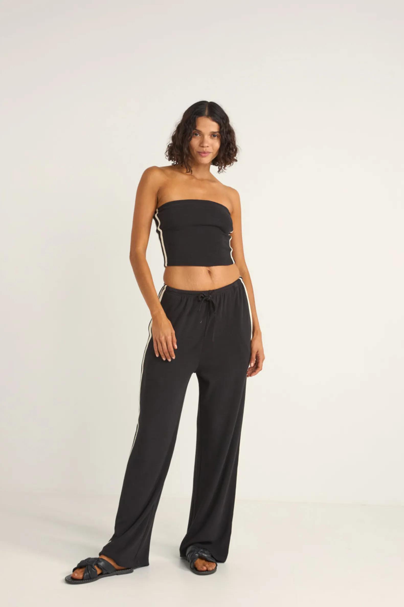 The Track Pant in Black features a relaxed high waist and straight leg, offering both style and comfort. Ideal for a sleek, sporty look.